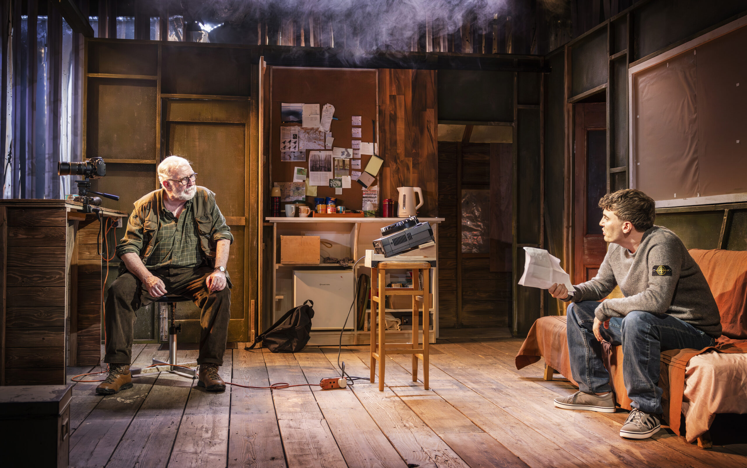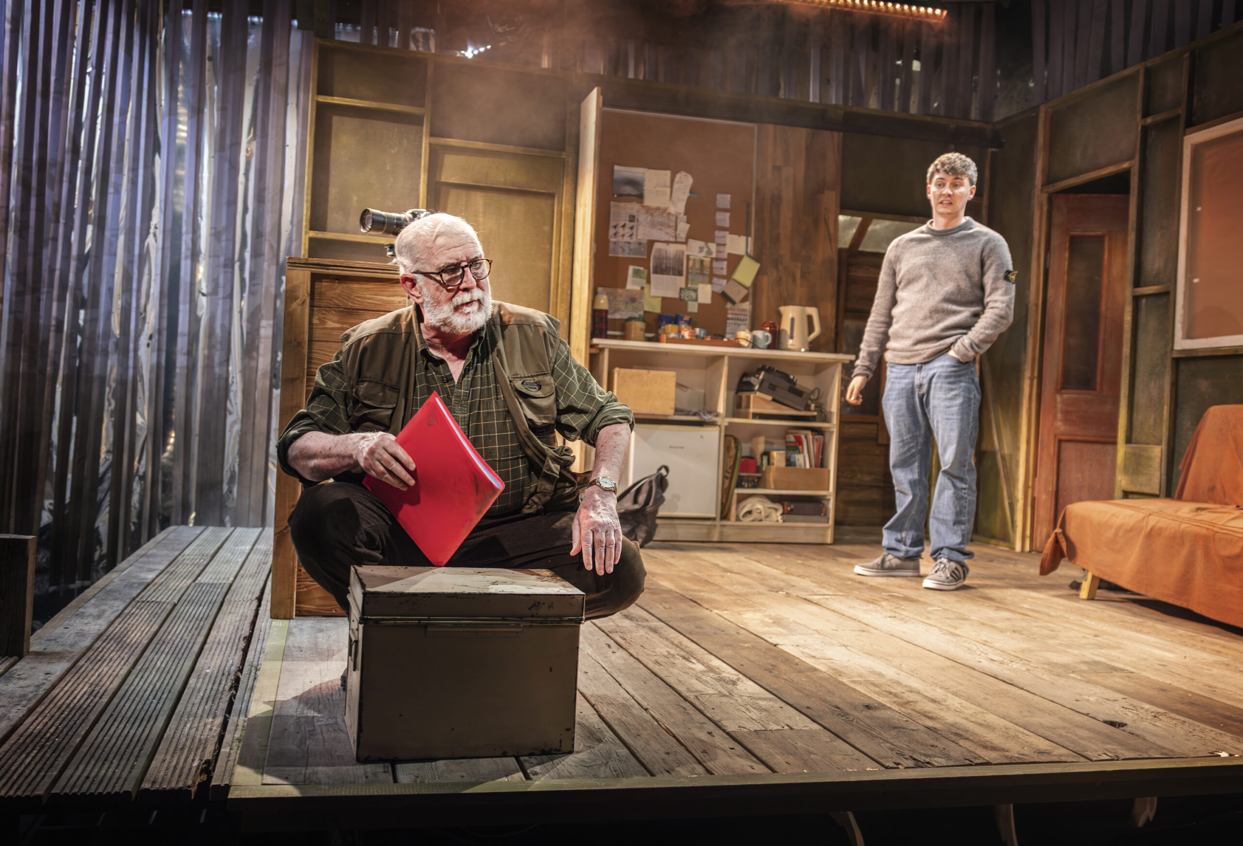 How do you captivate and educate an audience on the subject of wildlife photography? This may not necessarily be a topic that immediately comes to mind when thinking of a play; however, writer David Pearson has skilfully crafted Firewing, a dramatic piece that frames two characters in a remote hide (a camouflaged structure intended to conceal photographers so they can take close-up images of animals without disturbing them). In this dilapidated building in the middle of nowhere, grumpy, acerbic Tim (Gerard Horan), a seasoned and renowned wildlife photographer, meets Marcus (Charlie Beck), a young, naïve apprentice who arrives late on his first day of work. It is clear from the inception that there is friction and tension that often exists when two different generations collide. Tim, a Baby Boomer, has very traditional ideas and immediately asserts his power of age and perceived rank over the young Gen Z. The term “son” is used in a diminutive way, almost implying that Marcus is nobody, a nothing.